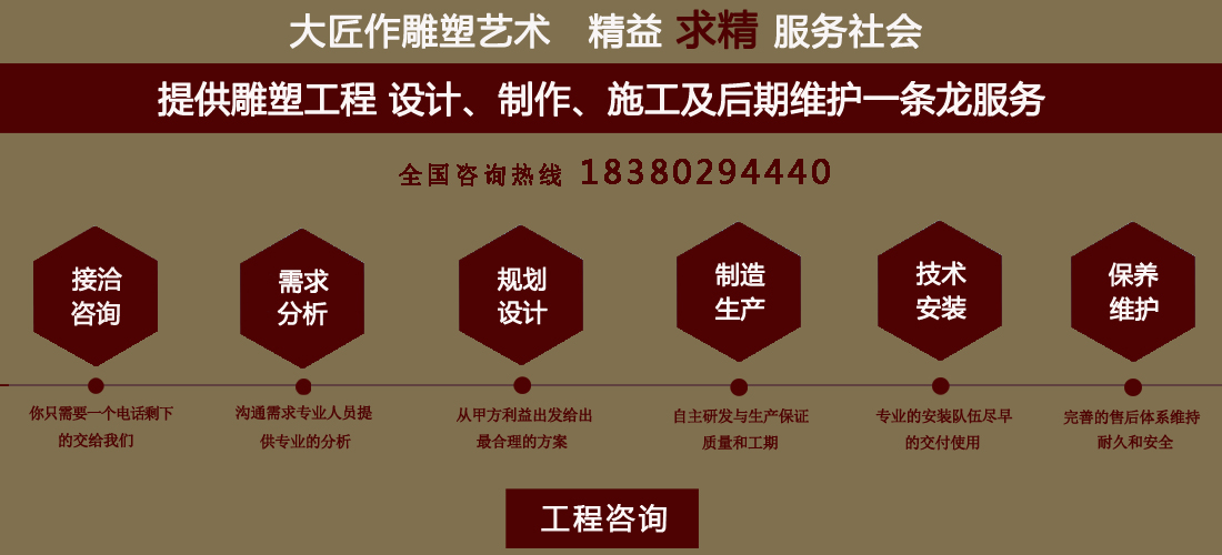 成都大匠作雕塑有限公司,是經(jīng)成都工商局審定注冊(cè)的正規(guī)專業(yè)雕塑制作及工程安裝服務(wù)機(jī)構(gòu),是由一群年輕富有朝氣的年輕人創(chuàng)辦,發(fā)軔于四川省成都市龍泉驛區(qū)。它是一家******于創(chuàng)作、制作和銷售為一體的公司。大匠作擁有多年從事公共藝術(shù)的專業(yè)人員和雕塑制作人組成的核心團(tuán)隊(duì),為您提供專業(yè)、具創(chuàng)新的設(shè)計(jì)及制作服務(wù)。公司成立以來,秉承“******服務(wù)、誠信為本”的宗旨,以客戶需求為目標(biāo)導(dǎo)向,不斷學(xué)習(xí),進(jìn)取,優(yōu)化和提高服務(wù)質(zhì)量,公司向您******——“您的滿意***是我們的信譽(yù)”,我們將以飽滿的熱情和******的服務(wù)贏得您的贊譽(yù)和支持。 愛心,細(xì)心,耐心,責(zé)任心是我們的要求,盡心盡職,為您打造出創(chuàng)新、專業(yè)、******的設(shè)計(jì)方案,我們堅(jiān)信先做人、后做事,用心對(duì)待客戶,實(shí)行透明收費(fèi),人性化服務(wù),本著對(duì)客戶負(fù)責(zé),對(duì)客戶負(fù)責(zé),更是對(duì)自己發(fā)展負(fù)責(zé)的態(tài)度,爭(zhēng)取做到讓每位客戶滿意